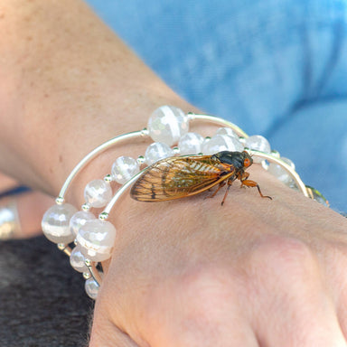 Elegant Sterling Silver Gratitude Bracelet; 12MM round White crystal pearl beads and Sterling Silver Links, Strung on Stretch Nylon; Standard Size ...