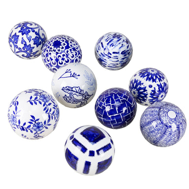 Rae Spheres, Each The exquisite Rae Spheres, a set of 9 luxurious ceramic orbs in stunning blue and white hues. Each orb boasts a unique pattern, a...