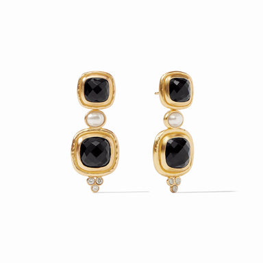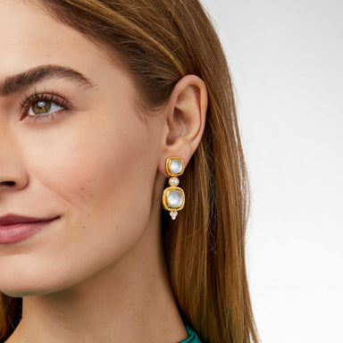This dramatic statement earring features two eye-catching cushion cut gemstones set in lightly hammered golden walls and linked by a shimmering pe...