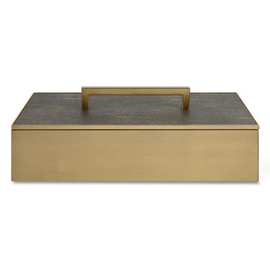 This elegant metal box features a timeless brass finish paired with a lift-off lid wrapped in sophisticated gray faux shagreen. A sleek brass handl...